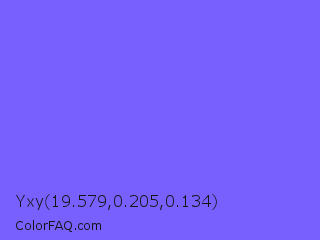 Yxy 19.579,0.205,0.134 Color is a light indigo color and the nearest color is Very Light Blue #6666ff. Hex code #7860ff and RGB value is rgb(120,96,255). In RGB color space, this color is composed of 47% red, 38% green, 100% blue, In CMYK color space, this color is composed of 53% cyan, 62% magenta, 0% yellow , 0% black , In HSL color space, this color has a hue angle of 249° , 100% saturation and 69% lightness.