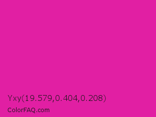 Yxy 19.579,0.404,0.208 Color is a normal magenta color and the nearest color is Frostbite #e936a7. Hex code #e11fa3 and RGB value is rgb(225,31,163). In RGB color space, this color is composed of 88% red, 12% green, 64% blue, In CMYK color space, this color is composed of 0% cyan, 86% magenta, 28% yellow , 12% black , In HSL color space, this color has a hue angle of 319° , 76% saturation and 50% lightness.