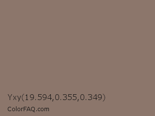 Yxy 19.594,0.355,0.349 Color is a normal orange color and the nearest color is Americano #87756e. Hex code #8c766b and RGB value is rgb(140,118,107). In RGB color space, this color is composed of 55% red, 46% green, 42% blue, In CMYK color space, this color is composed of 0% cyan, 16% magenta, 24% yellow , 45% black , In HSL color space, this color has a hue angle of 20° , 13% saturation and 48% lightness.