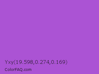 Yxy 19.598,0.274,0.169 Color is a normal purple color and the nearest color is Medium Orchid #ba55d3. Hex code #ab53d4 and RGB value is rgb(171,83,212). In RGB color space, this color is composed of 67% red, 33% green, 83% blue, In CMYK color space, this color is composed of 19% cyan, 61% magenta, 0% yellow , 17% black , In HSL color space, this color has a hue angle of 281° , 60% saturation and 58% lightness.