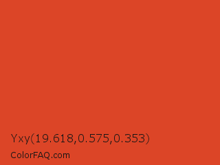 Yxy 19.618,0.575,0.353 Color is a normal red color and the nearest color is Punch #dc4333. Hex code #dc4527 and RGB value is rgb(220,69,39). In RGB color space, this color is composed of 86% red, 27% green, 15% blue, In CMYK color space, this color is composed of 0% cyan, 69% magenta, 82% yellow , 14% black , In HSL color space, this color has a hue angle of 10° , 72% saturation and 51% lightness.