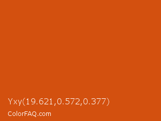Yxy 19.621,0.572,0.377 Color is a normal orange color and the nearest color is Burnt Orange #cc5500. Hex code #d3500f and RGB value is rgb(211,80,15). In RGB color space, this color is composed of 83% red, 31% green, 6% blue, In CMYK color space, this color is composed of 0% cyan, 62% magenta, 93% yellow , 17% black , In HSL color space, this color has a hue angle of 20° , 87% saturation and 44% lightness.