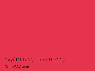 Yxy 19.622,0.552,0.311 Color is a normal red color and the nearest color is Amaranth #e52b50. Hex code #e5344b and RGB value is rgb(229,52,75). In RGB color space, this color is composed of 90% red, 20% green, 29% blue, In CMYK color space, this color is composed of 0% cyan, 77% magenta, 67% yellow , 10% black , In HSL color space, this color has a hue angle of 352° , 77% saturation and 55% lightness.