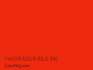 Yxy 19.622,0.62,0.34 Color is a normal red color and the nearest color is Red RYB #fe2712. Hex code #ed290e and RGB value is rgb(237,41,14). In RGB color space, this color is composed of 93% red, 16% green, 5% blue, In CMYK color space, this color is composed of 0% cyan, 83% magenta, 94% yellow , 7% black , In HSL color space, this color has a hue angle of 7° , 89% saturation and 49% lightness.