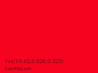Yxy 19.62,0.626,0.323 Color is a normal red color and the nearest color is Vivid Red #f70d1a. Hex code #f5031f and RGB value is rgb(245,3,31). In RGB color space, this color is composed of 96% red, 1% green, 12% blue, In CMYK color space, this color is composed of 0% cyan, 99% magenta, 87% yellow , 4% black , In HSL color space, this color has a hue angle of 353° , 98% saturation and 49% lightness.