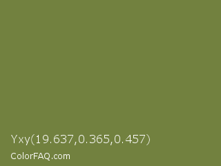 Yxy 19.637,0.365,0.457 Color is a normal lime color and the nearest color is Pesto #7c7631. Hex code #72813f and RGB value is rgb(114,129,63). In RGB color space, this color is composed of 45% red, 51% green, 25% blue, In CMYK color space, this color is composed of 12% cyan, 0% magenta, 51% yellow , 49% black , In HSL color space, this color has a hue angle of 74° , 34% saturation and 38% lightness.