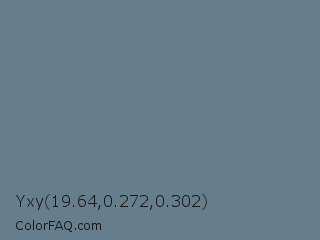 Yxy 19.64,0.272,0.302 Color is a normal blue color and the nearest color is Slate Gray #708090. Hex code #667e8c and RGB value is rgb(102,126,140). In RGB color space, this color is composed of 40% red, 49% green, 55% blue, In CMYK color space, this color is composed of 27% cyan, 10% magenta, 0% yellow , 45% black , In HSL color space, this color has a hue angle of 202° , 16% saturation and 47% lightness.
