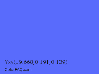 Yxy 19.668,0.191,0.139 Color is a light blue color and the nearest color is Very Light Blue #6666ff. Hex code #596bfc and RGB value is rgb(89,107,252). In RGB color space, this color is composed of 35% red, 42% green, 99% blue, In CMYK color space, this color is composed of 65% cyan, 58% magenta, 0% yellow , 1% black , In HSL color space, this color has a hue angle of 233° , 96% saturation and 67% lightness.