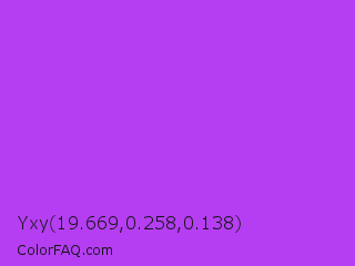 Yxy 19.669,0.258,0.138 Color is a normal purple color and the nearest color is Veronica #a020f0. Hex code #b53ef2 and RGB value is rgb(181,62,242). In RGB color space, this color is composed of 71% red, 24% green, 95% blue, In CMYK color space, this color is composed of 25% cyan, 74% magenta, 0% yellow , 5% black , In HSL color space, this color has a hue angle of 280° , 87% saturation and 60% lightness.