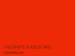 Yxy 19.671,0.622,0.342 Color is a normal red color and the nearest color is Ferrari Red #ff2800. Hex code #ed2a05 and RGB value is rgb(237,42,5). In RGB color space, this color is composed of 93% red, 16% green, 2% blue, In CMYK color space, this color is composed of 0% cyan, 82% magenta, 98% yellow , 7% black , In HSL color space, this color has a hue angle of 10° , 96% saturation and 47% lightness.