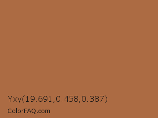 Yxy 19.691,0.458,0.387 Color is a normal orange color and the nearest color is Brown Sugar #af6e4d. Hex code #ac6b43 and RGB value is rgb(172,107,67). In RGB color space, this color is composed of 67% red, 42% green, 26% blue, In CMYK color space, this color is composed of 0% cyan, 38% magenta, 61% yellow , 33% black , In HSL color space, this color has a hue angle of 23° , 44% saturation and 47% lightness.