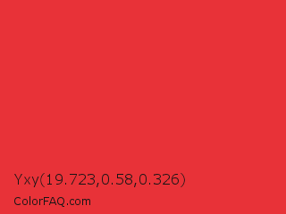 Yxy 19.723,0.58,0.326 Color is a normal red color and the nearest color is Deep Carmine Pink #ef3038. Hex code #e83238 and RGB value is rgb(232,50,56). In RGB color space, this color is composed of 91% red, 20% green, 22% blue, In CMYK color space, this color is composed of 0% cyan, 78% magenta, 76% yellow , 9% black , In HSL color space, this color has a hue angle of 358° , 80% saturation and 55% lightness.