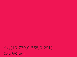 Yxy 19.739,0.558,0.291 Color is a normal rose color and the nearest color is Red Crayola #ee204d. Hex code #f01554 and RGB value is rgb(240,21,84). In RGB color space, this color is composed of 94% red, 8% green, 33% blue, In CMYK color space, this color is composed of 0% cyan, 91% magenta, 65% yellow , 6% black , In HSL color space, this color has a hue angle of 343° , 88% saturation and 51% lightness.