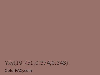 Yxy 19.751,0.374,0.343 Color is a normal red color and the nearest color is Toast #9a6e61. Hex code #98726a and RGB value is rgb(152,114,106). In RGB color space, this color is composed of 60% red, 45% green, 42% blue, In CMYK color space, this color is composed of 0% cyan, 25% magenta, 30% yellow , 40% black , In HSL color space, this color has a hue angle of 10° , 18% saturation and 51% lightness.
