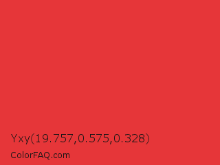 Yxy 19.757,0.575,0.328 Color is a normal red color and the nearest color is Deep Carmine Pink #ef3038. Hex code #e63639 and RGB value is rgb(230,54,57). In RGB color space, this color is composed of 90% red, 21% green, 22% blue, In CMYK color space, this color is composed of 0% cyan, 77% magenta, 75% yellow , 10% black , In HSL color space, this color has a hue angle of 359° , 78% saturation and 56% lightness.