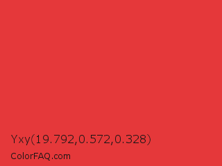 Yxy 19.792,0.572,0.328 Color is a normal red color and the nearest color is CG Red #e03c31. Hex code #e5383a and RGB value is rgb(229,56,58). In RGB color space, this color is composed of 90% red, 22% green, 23% blue, In CMYK color space, this color is composed of 0% cyan, 76% magenta, 75% yellow , 10% black , In HSL color space, this color has a hue angle of 359° , 77% saturation and 56% lightness.