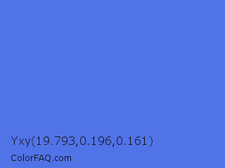 Yxy 19.793,0.196,0.161 Color is a light blue color and the nearest color is Royal Blue #4169e1. Hex code #5173e8 and RGB value is rgb(81,115,232). In RGB color space, this color is composed of 32% red, 45% green, 91% blue, In CMYK color space, this color is composed of 65% cyan, 50% magenta, 0% yellow , 9% black , In HSL color space, this color has a hue angle of 226° , 77% saturation and 61% lightness.