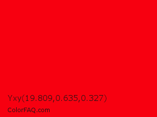Yxy 19.809,0.635,0.327 Color is a normal red color and the nearest color is KU Crimson #e8000d. Hex code #f70010 and RGB value is rgb(247,0,16). In RGB color space, this color is composed of 97% red, 0% green, 6% blue, In CMYK color space, this color is composed of 0% cyan, 100% magenta, 94% yellow , 3% black , In HSL color space, this color has a hue angle of 356° , 100% saturation and 48% lightness.