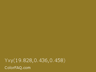 Yxy 19.828,0.436,0.458 Color is a normal yellow color and the nearest color is Hacienda #98811b. Hex code #917925 and RGB value is rgb(145,121,37). In RGB color space, this color is composed of 57% red, 47% green, 15% blue, In CMYK color space, this color is composed of 0% cyan, 17% magenta, 74% yellow , 43% black , In HSL color space, this color has a hue angle of 47° , 59% saturation and 36% lightness.