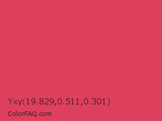 Yxy 19.829,0.511,0.301 Color is a normal red color and the nearest color is Paradise Pink #e63e62. Hex code #dd405d and RGB value is rgb(221,64,93). In RGB color space, this color is composed of 87% red, 25% green, 36% blue, In CMYK color space, this color is composed of 0% cyan, 71% magenta, 58% yellow , 13% black , In HSL color space, this color has a hue angle of 349° , 70% saturation and 56% lightness.