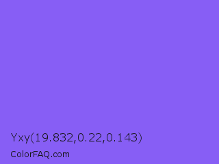 Yxy 19.832,0.22,0.143 Color is a light indigo color and the nearest color is Medium Slate Blue #7b68ee. Hex code #875ef5 and RGB value is rgb(135,94,245). In RGB color space, this color is composed of 53% red, 37% green, 96% blue, In CMYK color space, this color is composed of 45% cyan, 62% magenta, 0% yellow , 4% black , In HSL color space, this color has a hue angle of 256° , 88% saturation and 66% lightness.
