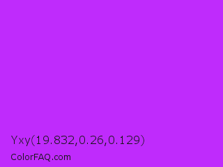 Yxy 19.832,0.26,0.129 Color is a normal purple color and the nearest color is Veronica #a020f0. Hex code #bf2bfc and RGB value is rgb(191,43,252). In RGB color space, this color is composed of 75% red, 17% green, 99% blue, In CMYK color space, this color is composed of 24% cyan, 83% magenta, 0% yellow , 1% black , In HSL color space, this color has a hue angle of 282° , 97% saturation and 58% lightness.