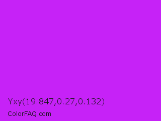 Yxy 19.847,0.27,0.132 Color is a normal purple color and the nearest color is Vivid Mulberry #b80ce3. Hex code #c622f7 and RGB value is rgb(198,34,247). In RGB color space, this color is composed of 78% red, 13% green, 97% blue, In CMYK color space, this color is composed of 20% cyan, 86% magenta, 0% yellow , 3% black , In HSL color space, this color has a hue angle of 286° , 93% saturation and 55% lightness.