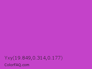 Yxy 19.849,0.314,0.177 Color is a normal magenta color and the nearest color is Steel Pink #cc33cc. Hex code #c442c9 and RGB value is rgb(196,66,201). In RGB color space, this color is composed of 77% red, 26% green, 79% blue, In CMYK color space, this color is composed of 2% cyan, 67% magenta, 0% yellow , 21% black , In HSL color space, this color has a hue angle of 298° , 56% saturation and 52% lightness.