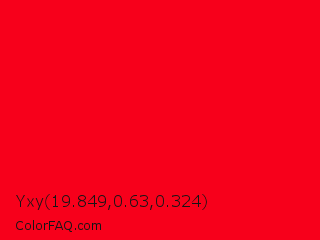 Yxy 19.849,0.63,0.324 Color is a normal red color and the nearest color is Vivid Red #f70d1a. Hex code #f7001b and RGB value is rgb(247,0,27). In RGB color space, this color is composed of 97% red, 0% green, 11% blue, In CMYK color space, this color is composed of 0% cyan, 100% magenta, 89% yellow , 3% black , In HSL color space, this color has a hue angle of 353° , 100% saturation and 48% lightness.