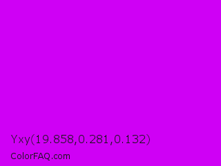 Yxy 19.858,0.281,0.132 Color is a normal purple color and the nearest color is Vivid Orchid #cc00ff. Hex code #cf00f5 and RGB value is rgb(207,0,245). In RGB color space, this color is composed of 81% red, 0% green, 96% blue, In CMYK color space, this color is composed of 16% cyan, 100% magenta, 0% yellow , 4% black , In HSL color space, this color has a hue angle of 291° , 100% saturation and 48% lightness.
