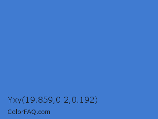 Yxy 19.859,0.2,0.192 Color is a normal blue color and the nearest color is Han Blue #446ccf. Hex code #407bd1 and RGB value is rgb(64,123,209). In RGB color space, this color is composed of 25% red, 48% green, 82% blue, In CMYK color space, this color is composed of 69% cyan, 41% magenta, 0% yellow , 18% black , In HSL color space, this color has a hue angle of 216° , 61% saturation and 54% lightness.