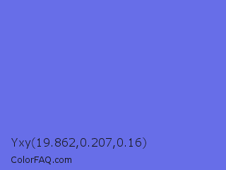Yxy 19.862,0.207,0.16 Color is a light blue color and the nearest color is Medium Slate Blue #7b68ee. Hex code #676ee8 and RGB value is rgb(103,110,232). In RGB color space, this color is composed of 40% red, 43% green, 91% blue, In CMYK color space, this color is composed of 56% cyan, 53% magenta, 0% yellow , 9% black , In HSL color space, this color has a hue angle of 237° , 74% saturation and 66% lightness.