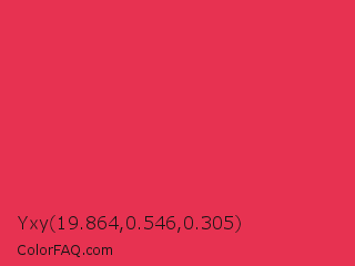 Yxy 19.864,0.546,0.305 Color is a normal red color and the nearest color is Amaranth #e52b50. Hex code #e73251 and RGB value is rgb(231,50,81). In RGB color space, this color is composed of 91% red, 20% green, 32% blue, In CMYK color space, this color is composed of 0% cyan, 78% magenta, 65% yellow , 9% black , In HSL color space, this color has a hue angle of 350° , 79% saturation and 55% lightness.
