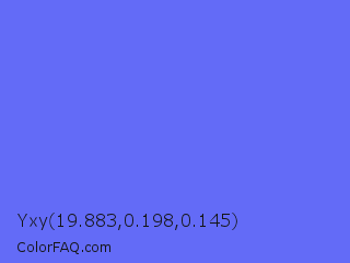 Yxy 19.883,0.198,0.145 Color is a light blue color and the nearest color is Very Light Blue #6666ff. Hex code #636bf7 and RGB value is rgb(99,107,247). In RGB color space, this color is composed of 39% red, 42% green, 97% blue, In CMYK color space, this color is composed of 60% cyan, 57% magenta, 0% yellow , 3% black , In HSL color space, this color has a hue angle of 237° , 90% saturation and 68% lightness.