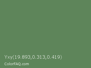 Yxy 19.893,0.313,0.419 Color is a normal green color and the nearest color is Glade Green #61845f. Hex code #5e855a and RGB value is rgb(94,133,90). In RGB color space, this color is composed of 37% red, 52% green, 35% blue, In CMYK color space, this color is composed of 29% cyan, 0% magenta, 32% yellow , 48% black , In HSL color space, this color has a hue angle of 114° , 19% saturation and 44% lightness.