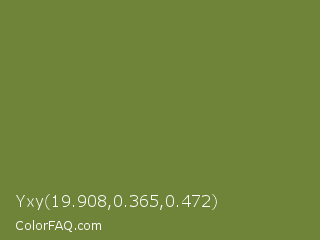 Yxy 19.908,0.365,0.472 Color is a normal lime color and the nearest color is Crete #737829. Hex code #6f8339 and RGB value is rgb(111,131,57). In RGB color space, this color is composed of 44% red, 51% green, 22% blue, In CMYK color space, this color is composed of 15% cyan, 0% magenta, 56% yellow , 49% black , In HSL color space, this color has a hue angle of 76° , 39% saturation and 37% lightness.