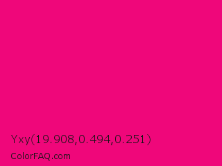 Yxy 19.908,0.494,0.251 Color is a normal rose color and the nearest color is Red Purple #e40078. Hex code #ef077a and RGB value is rgb(239,7,122). In RGB color space, this color is composed of 94% red, 3% green, 48% blue, In CMYK color space, this color is composed of 0% cyan, 97% magenta, 49% yellow , 6% black , In HSL color space, this color has a hue angle of 330° , 94% saturation and 48% lightness.