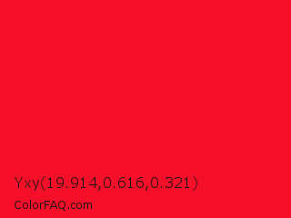 Yxy 19.914,0.616,0.321 Color is a normal red color and the nearest color is Torch Red #fd0e35. Hex code #f50f29 and RGB value is rgb(245,15,41). In RGB color space, this color is composed of 96% red, 6% green, 16% blue, In CMYK color space, this color is composed of 0% cyan, 94% magenta, 83% yellow , 4% black , In HSL color space, this color has a hue angle of 353° , 92% saturation and 51% lightness.