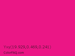 Yxy 19.929,0.469,0.241 Color is a normal rose color and the nearest color is Barbie Pink #e0218a. Hex code #eb1685 and RGB value is rgb(235,22,133). In RGB color space, this color is composed of 92% red, 9% green, 52% blue, In CMYK color space, this color is composed of 0% cyan, 91% magenta, 43% yellow , 8% black , In HSL color space, this color has a hue angle of 329° , 84% saturation and 50% lightness.