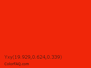 Yxy 19.929,0.624,0.339 Color is a normal red color and the nearest color is Red RYB #fe2712. Hex code #f02609 and RGB value is rgb(240,38,9). In RGB color space, this color is composed of 94% red, 15% green, 4% blue, In CMYK color space, this color is composed of 0% cyan, 84% magenta, 96% yellow , 6% black , In HSL color space, this color has a hue angle of 8° , 93% saturation and 49% lightness.