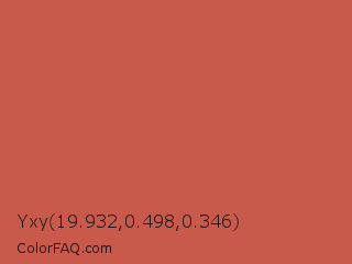 Yxy 19.932,0.498,0.346 Color is a normal red color and the nearest color is Cedar Chest #c95a49. Hex code #c8594b and RGB value is rgb(200,89,75). In RGB color space, this color is composed of 78% red, 35% green, 29% blue, In CMYK color space, this color is composed of 0% cyan, 56% magenta, 63% yellow , 22% black , In HSL color space, this color has a hue angle of 7° , 53% saturation and 54% lightness.