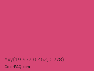 Yxy 19.937,0.462,0.278 Color is a normal rose color and the nearest color is Cabaret #d94972. Hex code #d64674 and RGB value is rgb(214,70,116). In RGB color space, this color is composed of 84% red, 27% green, 45% blue, In CMYK color space, this color is composed of 0% cyan, 67% magenta, 46% yellow , 16% black , In HSL color space, this color has a hue angle of 341° , 64% saturation and 56% lightness.