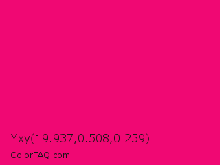 Yxy 19.937,0.508,0.259 Color is a normal rose color and the nearest color is Red Purple #e40078. Hex code #f00873 and RGB value is rgb(240,8,115). In RGB color space, this color is composed of 94% red, 3% green, 45% blue, In CMYK color space, this color is composed of 0% cyan, 97% magenta, 52% yellow , 6% black , In HSL color space, this color has a hue angle of 332° , 94% saturation and 49% lightness.