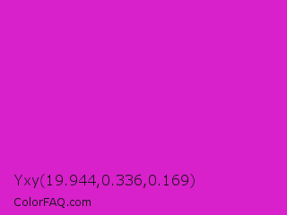 Yxy 19.944,0.336,0.169 Color is a normal magenta color and the nearest color is Steel Pink #cc33cc. Hex code #d820cb and RGB value is rgb(216,32,203). In RGB color space, this color is composed of 85% red, 13% green, 80% blue, In CMYK color space, this color is composed of 0% cyan, 85% magenta, 6% yellow , 15% black , In HSL color space, this color has a hue angle of 304° , 74% saturation and 49% lightness.
