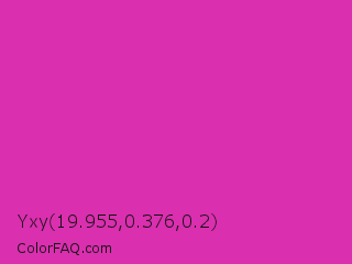 Yxy 19.955,0.376,0.2 Color is a normal magenta color and the nearest color is Frostbite #e936a7. Hex code #da2faf and RGB value is rgb(218,47,175). In RGB color space, this color is composed of 85% red, 18% green, 69% blue, In CMYK color space, this color is composed of 0% cyan, 78% magenta, 20% yellow , 15% black , In HSL color space, this color has a hue angle of 315° , 70% saturation and 52% lightness.