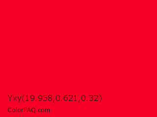 Yxy 19.958,0.621,0.32 Color is a normal red color and the nearest color is Ruddy #ff0028. Hex code #f70226 and RGB value is rgb(247,2,38). In RGB color space, this color is composed of 97% red, 1% green, 15% blue, In CMYK color space, this color is composed of 0% cyan, 99% magenta, 85% yellow , 3% black , In HSL color space, this color has a hue angle of 351° , 98% saturation and 49% lightness.