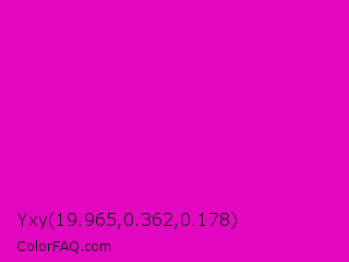 Yxy 19.965,0.362,0.178 Color is a normal magenta color and the nearest color is Deep Magenta #cc00cc. Hex code #e108c0 and RGB value is rgb(225,8,192). In RGB color space, this color is composed of 88% red, 3% green, 75% blue, In CMYK color space, this color is composed of 0% cyan, 96% magenta, 15% yellow , 12% black , In HSL color space, this color has a hue angle of 309° , 93% saturation and 46% lightness.