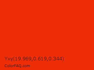 Yxy 19.969,0.619,0.344 Color is a normal red color and the nearest color is Ferrari Red #ff2800. Hex code #ed2e06 and RGB value is rgb(237,46,6). In RGB color space, this color is composed of 93% red, 18% green, 2% blue, In CMYK color space, this color is composed of 0% cyan, 81% magenta, 97% yellow , 7% black , In HSL color space, this color has a hue angle of 10° , 95% saturation and 48% lightness.