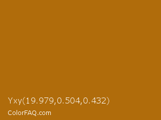 Yxy 19.979,0.504,0.432 Color is a normal orange color and the nearest color is Mai Tai #b06608. Hex code #b06c0b and RGB value is rgb(176,108,11). In RGB color space, this color is composed of 69% red, 42% green, 4% blue, In CMYK color space, this color is composed of 0% cyan, 39% magenta, 94% yellow , 31% black , In HSL color space, this color has a hue angle of 35° , 88% saturation and 37% lightness.