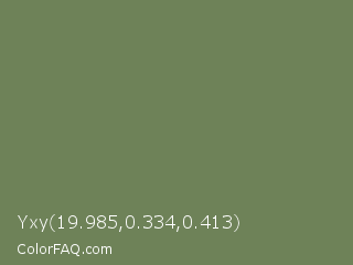 Yxy 19.985,0.334,0.413 Color is a normal green color and the nearest color is Limed Ash #747d63. Hex code #6e8258 and RGB value is rgb(110,130,88). In RGB color space, this color is composed of 43% red, 51% green, 35% blue, In CMYK color space, this color is composed of 15% cyan, 0% magenta, 32% yellow , 49% black , In HSL color space, this color has a hue angle of 89° , 19% saturation and 43% lightness.